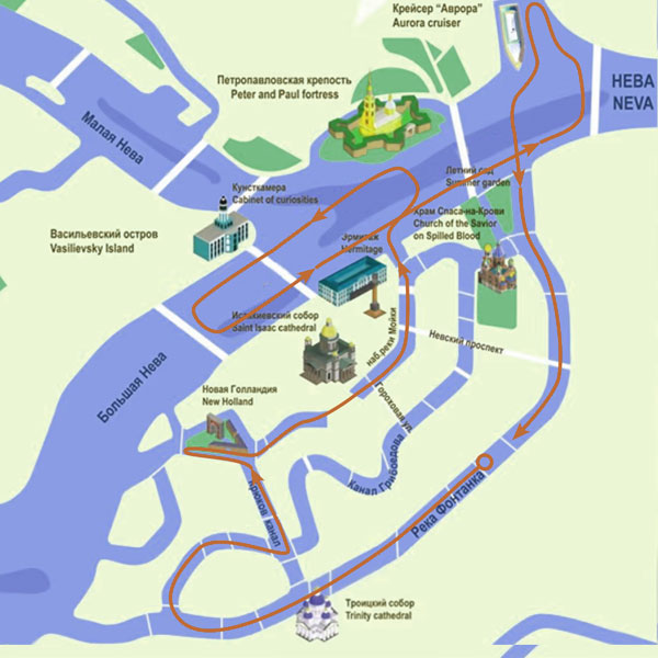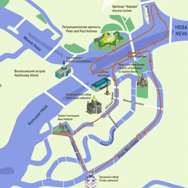 Маршрут №4: Фонтанка, Крюков канал, Мойка, Большая Нева, ФонтанкаМаршрут включает: Исаакиевский собор, Новую Голландию, Зимний дворец, Эрмитаж, Стрелку Васильевского острова, Кунсткамеру, Адмиралтейство, "Медный всадник", Летний сад, Меньшиковский дворец, Инженерный замок, Храм Спаса-на-Крови и проход под двумя разводными мостами Петербурга
