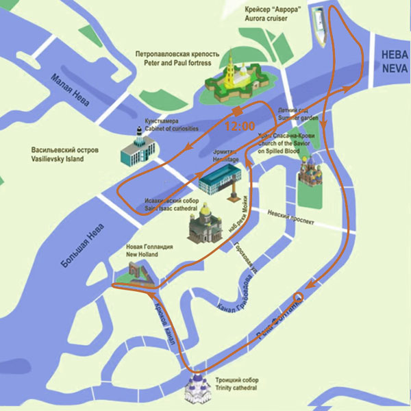 Маршрут #3: Фонтанка, Крюков канал, Мойка, Зимняя канавка, Петропавловская крепость, крейсер АврораКольцевой круиз с остановкой посреди Большой Невы напротив бастиона Петропавловской крепости и ожаданием выстрела в 12:00. Достопримечательности: Новая Голландия, Мариинка, Исаакиевский собор, выход в Неву, Петропавловская крепость, Инженерный замок, Усадьба Шереметьевых, Аничков мост