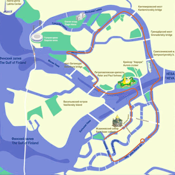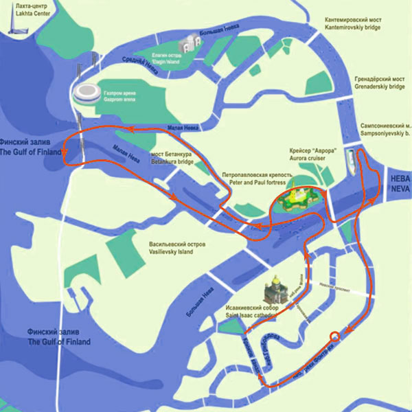 Маршрут №6: Мойка, Малая Нева, Ждановка, Малая Невка, Финский залив, Большая НеваМаршрут включает: проход под разводными мостами и вантовым мостом КАД, Исаакиевский собор, Зимний дворец, Адмиралтейство, Газпром-Арена, Лахта-центр, Стрелка Васильевского острова, Петропавловская крепость, Кронверк, Крейсер Аврора, Мост Бетанкура, Лахта центр, Инженерный замок